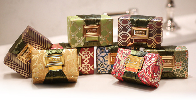 每個奢華沐浴皂均手工包裝於特製的金邊紙材中,並以時尚緞帶包覆,再扣上Agraria精美的金色標牌。每款香味都有其獨特的圖騰標示。