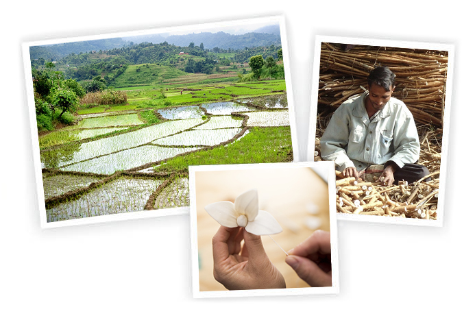 Agraria大擴香所使用的獨特索拉花朵,生產於印度工匠的巧手,只生長在東南亞地區的索拉木為水生植物,時常在土壤肥沃的水稻田中出現,過去被當地農民視為威脅稻作的有害植物。每年的九月份,是索拉木的採收季節,Agraria充分使用這些原料,使之蛻變成美麗的索拉木擴香花,賦予它截然不同的新生命。