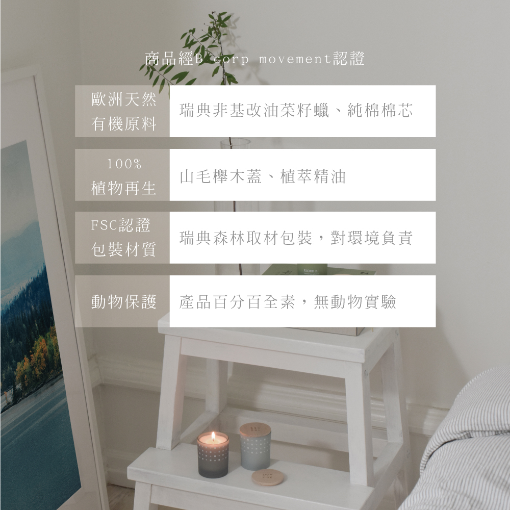 | 成分 | 100%植物蠟(油菜籽蠟)、無鉛純棉芯、天然精油和香水等級香氛油