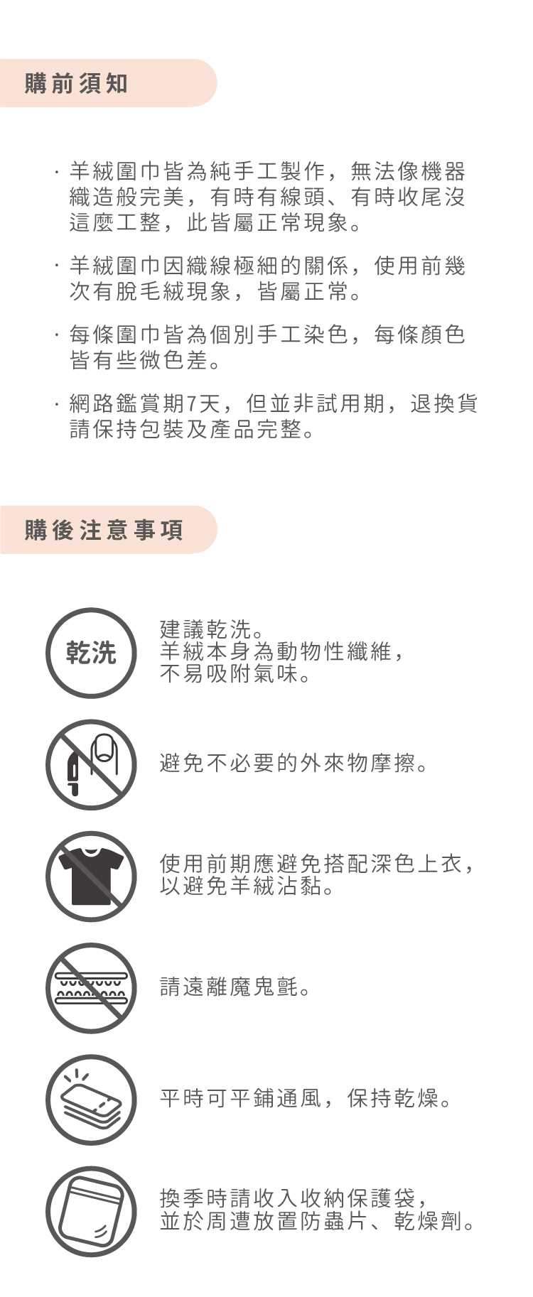 商品皆為人工織做,每一條圍巾皆會有些微染色、尺寸等差異,售出皆經過兩道人工檢查,完美主義者請勿下標。